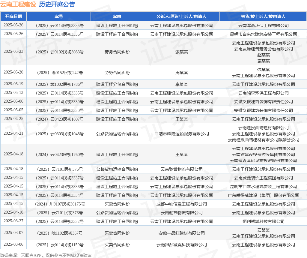 案号:(2025)云0114民初3335号审理法院:昆明市呈贡区人民法院案由:建设工程施工合同纠纷当事人信息: 原告/上诉人:云南工程建设总承包股份有限公司 被告/被上诉人:云南鸿森环保工程有限公司开庭日期:2025年5月13日根据统计,近一年内以云南工程建设总承包股份有限公司为当事人的历史开庭公告有69则,其中案由为“建设工程施工合同纠纷”的公告以27则居首,其次为“买卖合同纠纷”有11则,“建设工程分包合同纠纷”有8则。历史开庭公告(前20条)如下: